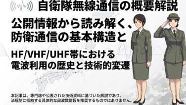 HF無線 【解説】自衛隊通信の現況─各周波数帯の用途概論 【本記事をお読みいただく前の注意点】本稿は、長年専門誌等で扱われてきた公開情報に基づき、日本の電波利用の歴史と技術的変遷を記録するものです。現在、暗号化のないアナログ通信の傍受は法規制の対象外ですが、近年の安保環境の変化に伴う新法制定(スパ... 2025.10.30 HF無線おすすめ記事ミリタリー無線