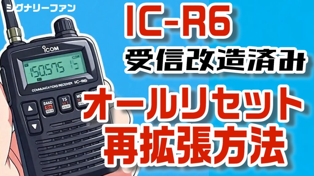 IC-R6は受信改造済みでも、オールリセットを実行するとノーマル状態に戻ります。 再びフルカバー状態へ戻すには、以下の操作が必要です。 本記事では、オールリセットの方法、受信拡張の復帰手順、復帰の確認方法を簡潔に紹介しま … 続きを読む IC-R6(受信改造済み)をオールリセットから受信拡張状態へ戻す方法