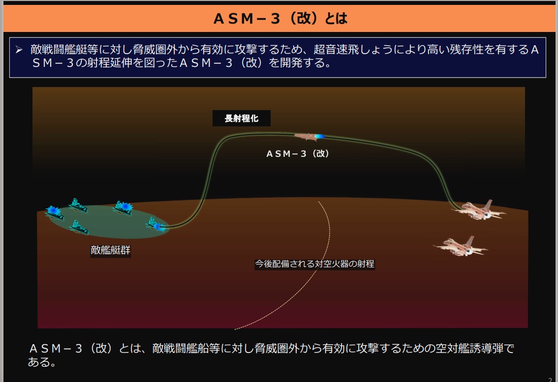 文部科学省によれば、この自衛隊のミサイル「ASM-3(改)」とは、敵戦闘艦船等に対し脅威圏外から有効に攻撃するための空対艦誘導弾です。敵戦闘艦艇等に対し脅威圏外から有効に攻撃するため、超音速飛しょうにより高い残存性を有しています。