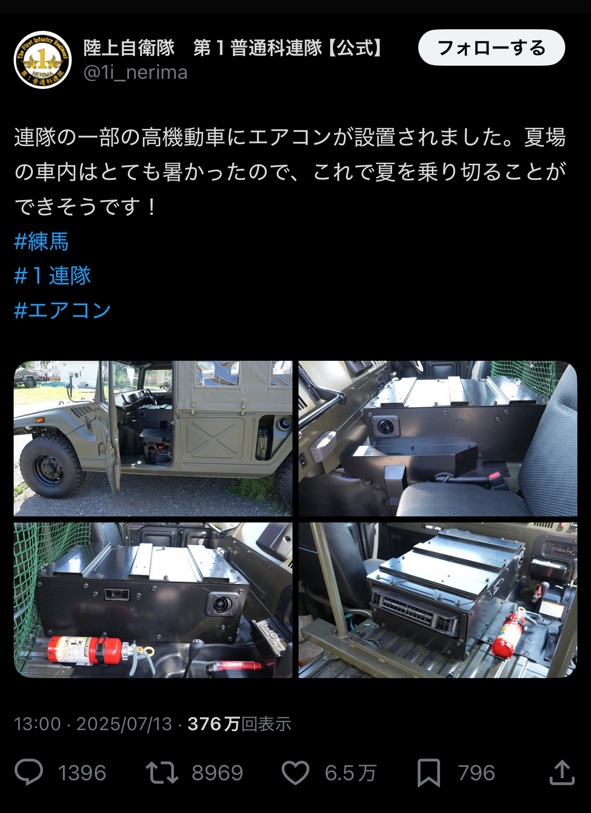 ただし、陸上自衛隊第一普通科連隊の公式SNSアカウントによれば、1部ではエアコンが装備されている車両も存在します。